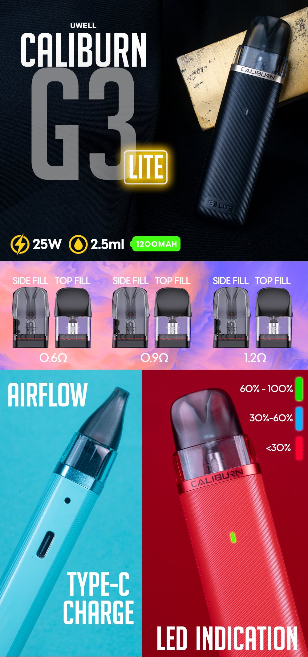 - 1x 0.9 Ω CALIBURN G3 Integrated Coil Cartridge (top refill)